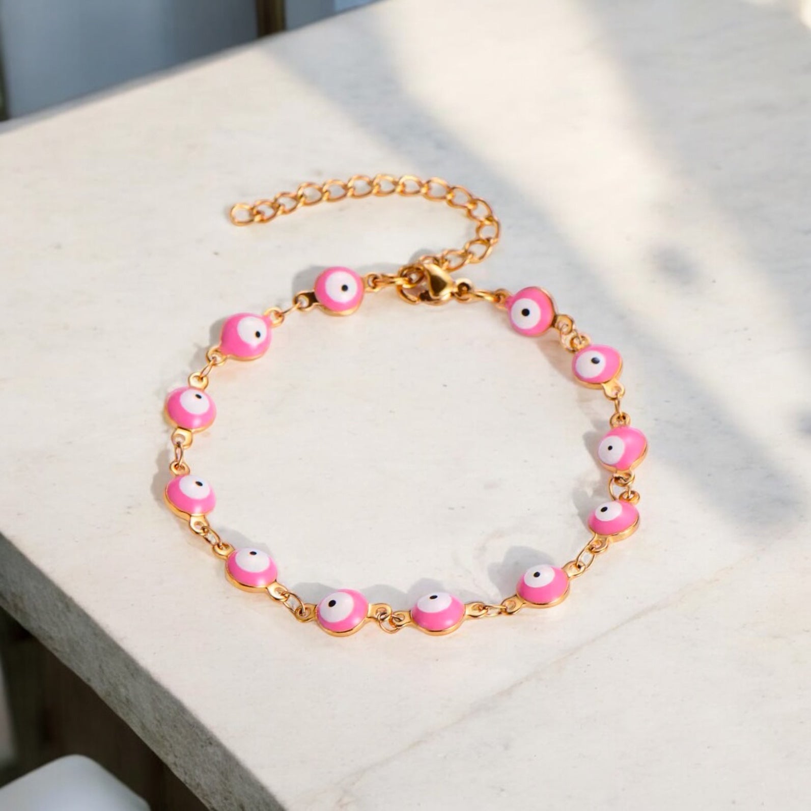 Pink Evil Eye Beaded Bracelet - 14k Gold Plated