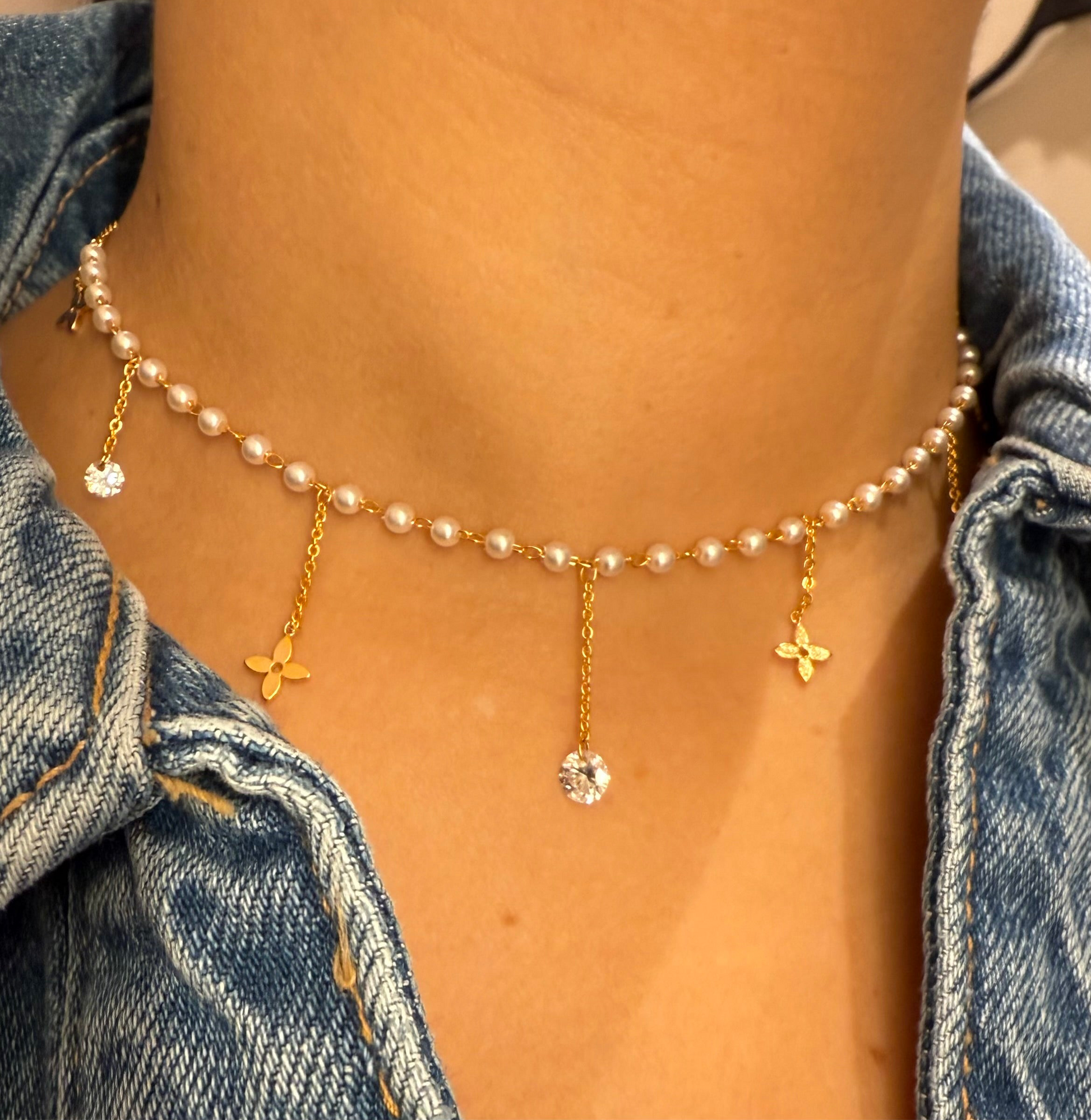 Elevate your everyday style with this elegant pearl choker featuring delicate gold accents and sparkling crystal drops. The necklace is adorned with a row of lustrous pearls, complemented by dangling gold charms and shimmering stones that catch the light with every movement.